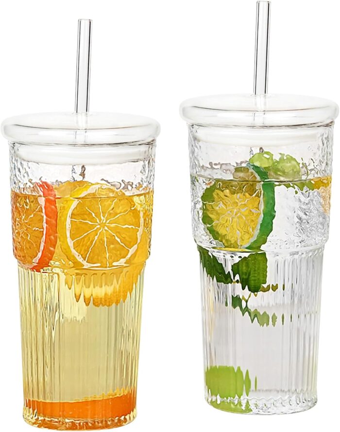 Glass Cups with Straws and Lids 2Pcs, 20oz Glass Cups Drinking Jar, Clear Iced Coffee Cups, Vintage Ripple Glassware for Water Coffee Tea, Clear
