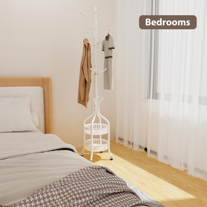 - 【Multifunctional Storage Space】This coat rack freestanding has 12 hooks easily meet your daily hanging needs,also double layer basket can put in your bags ,shoes, and other daily small items,allowing for organized storage and keeping your home tidy,make your mood at home infinitely beautiful all day long.